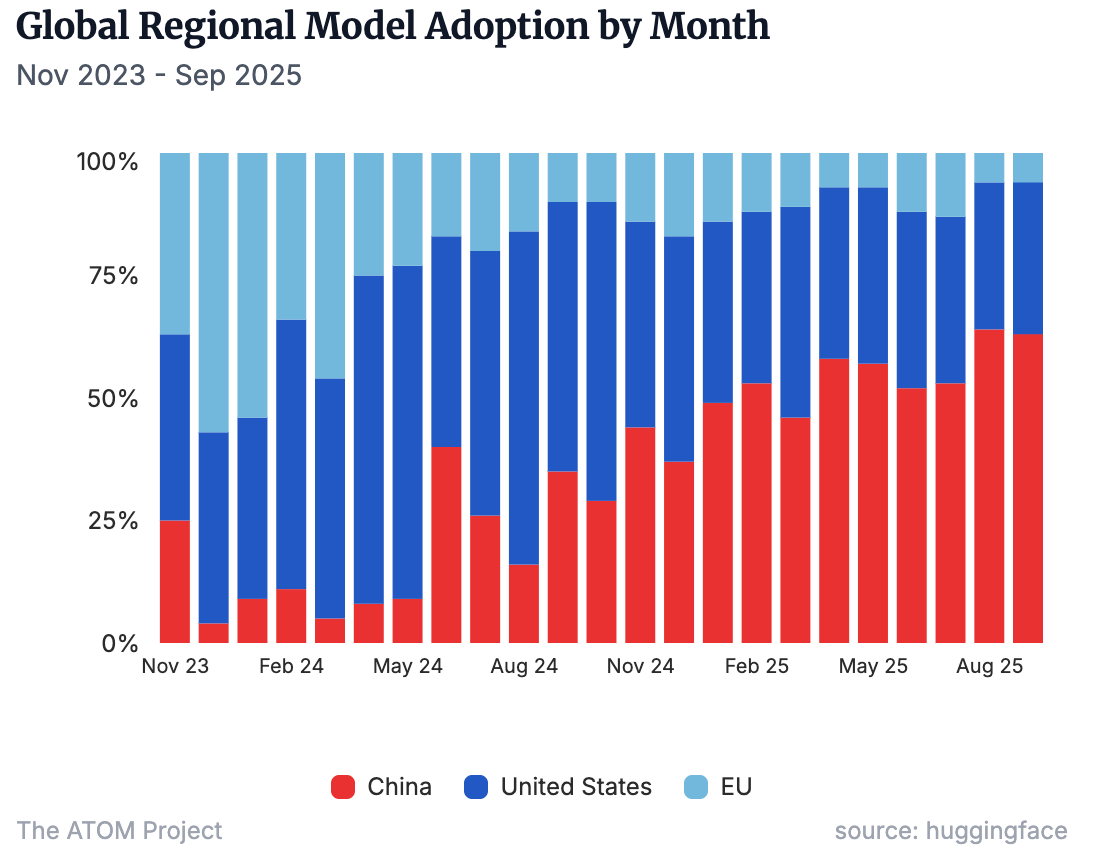 Monthly share of new finetunes and derivative models, by region of the base model’s creator.