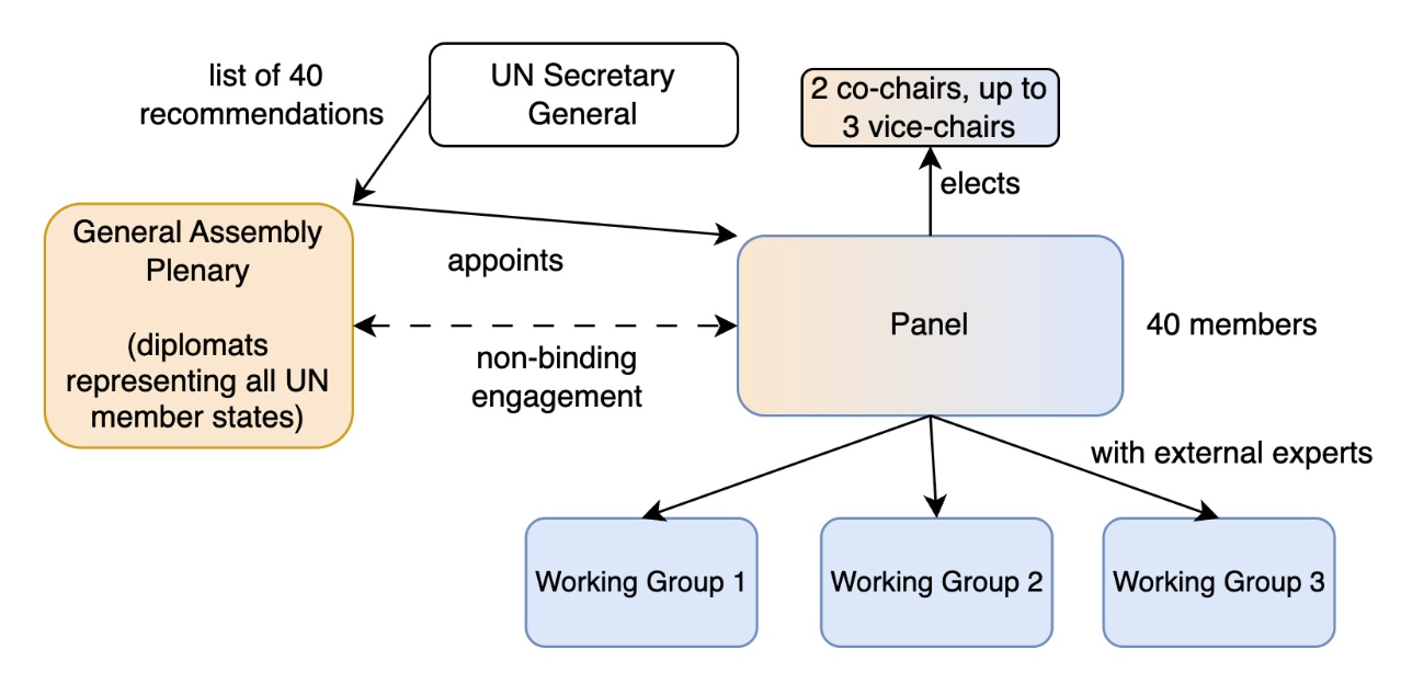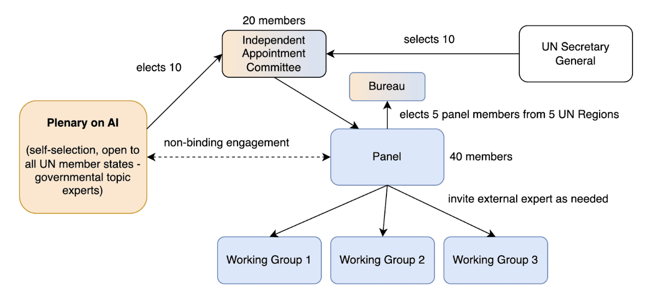 In the panel structure of Rev.3, the “Independent Appointment Committee” has been replaced with a direct, criteria-based selection of the “Panel” that involves the Secretary General with confirmation through the General Assembly. Similarly, the governmental experts in the Plenary of AI have been replaced by the General Assembly Plenary.