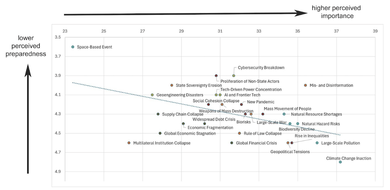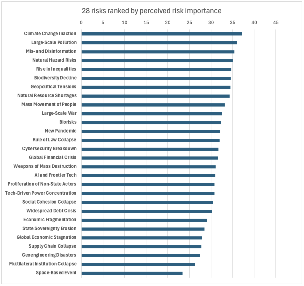 As such, risk perception also has greater year-to-year variance than domain expert risk assessments. The data for the Global Risk Report was collected between February and May 2024 and we hope the UN will reduce this lag in future iterations. For example, we might expect that “economic fragmentation” would rank higher on the list of concerns after “Liberation Day” in April 2025.