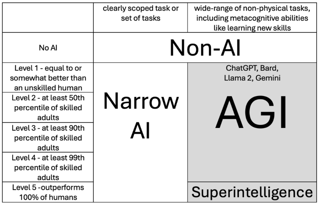 In 2024, a group of Google Deepmind researchers published a categorization that distinguishes between different levels of AGI. This group notably includes Shane Legg, the co-founder of Deepmind, who coined the term Artificial General Intelligence, and has written a PhD on intelligence definitions.